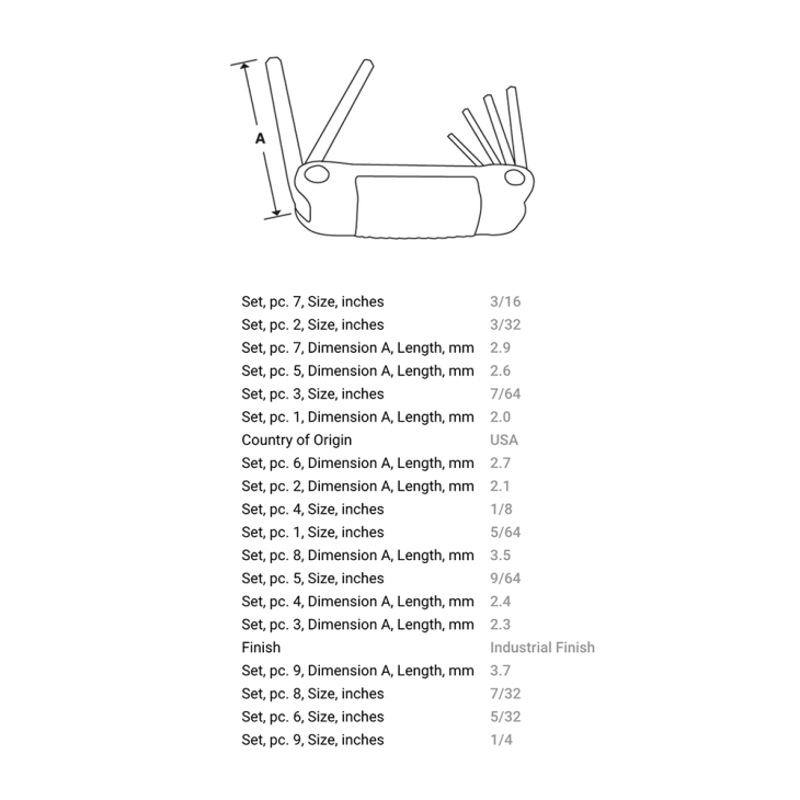 • 9 件折疊式:5/64"、3/32"、7/64"、1/8"、9/64"、5/32"、3/16"、7/32"、1/4" 扳手組