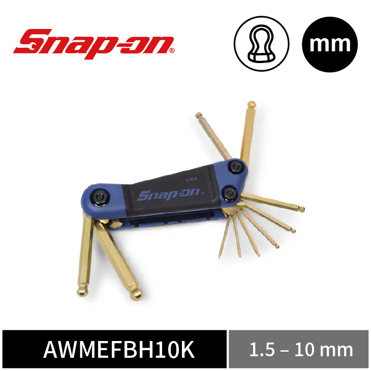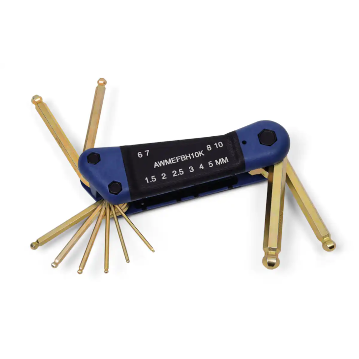 • 10 件折疊式:1.5、2、2.5、3 – 8、10 mm 扳手組 • 球型端設計可在不需拔出並重新定位扳手的情況下,連續旋轉螺栓 • 鍍金塗層相較於傳統鍍層能提供更優異的防蝕保護,更可提高工具辨識度