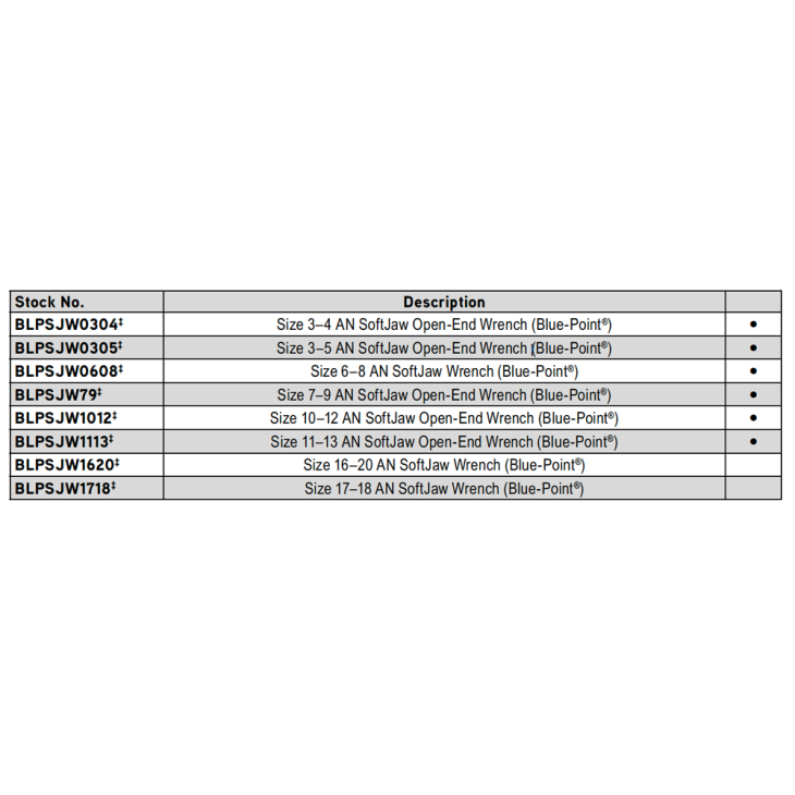 ![]() | Size 3-4 AN SoftJaw Open-End Wrench (Blue-Point®) | BLPSJW0304 | ||