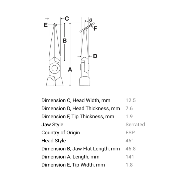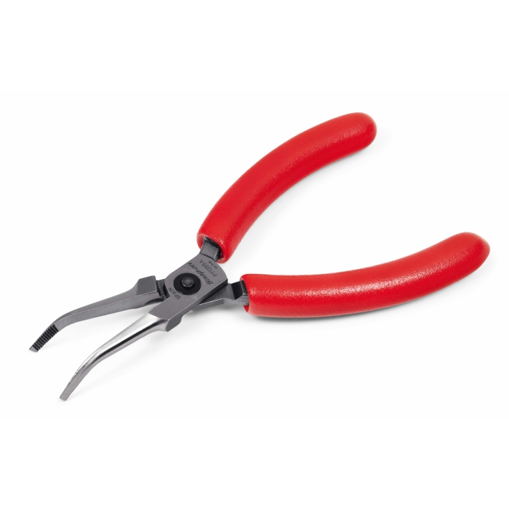 • 45° 彎頭尖嘴設計,搭配鋸齒狀鉗口,可在狹窄空間中穩定夾持小型零件、端子或彈簧