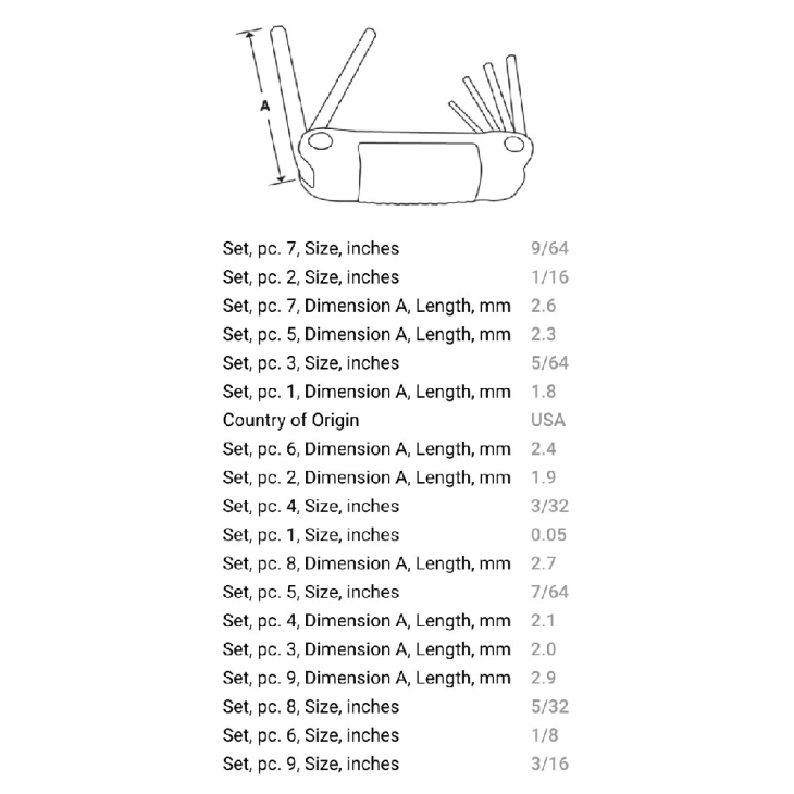 • 9 件折疊式:.050"、1/16"、5/64"、3/32"、7/64"、1/8"、9/64"、5/32"、3/16" 扳手組
