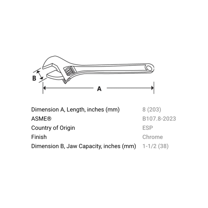 | Dimension A, Length, inches (mm) | 8 (203) | |