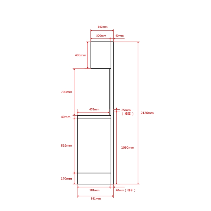| 二列組合後尺寸: W 1354 x D 541 x H 2126 mm(組合時需加裝後方立柱 D = 501 + 40 mm) | ||