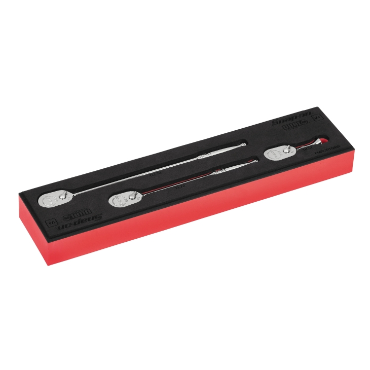 • 3 件式:含極短柄、長柄、特長柄可逆棘輪扳手組,附工具收納 PRO-FI™泡綿