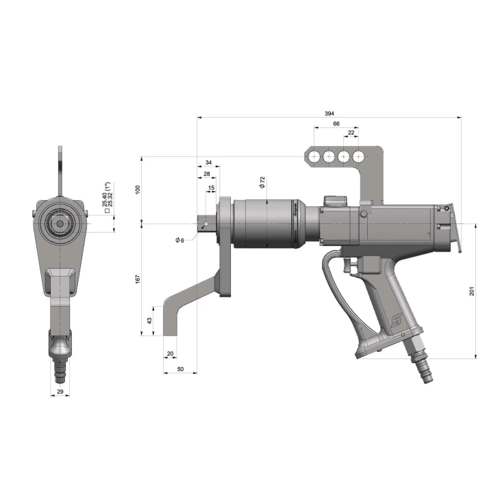 • 獨立旋轉齒輪箱,當反作用力臂抵住支撐點時,扭力反應不會傳導回操作手柄