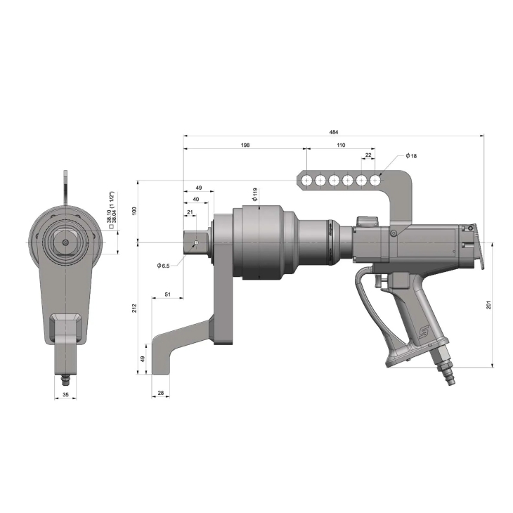 • 獨立旋轉齒輪箱,當反作用力臂抵住支撐點時,扭力反應不會傳導回操作手柄