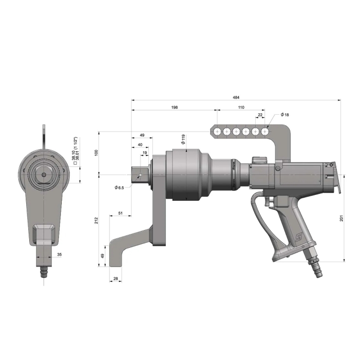 • 獨立旋轉齒輪箱,當反作用力臂抵住支撐點時,扭力反應不會傳導回操作手柄