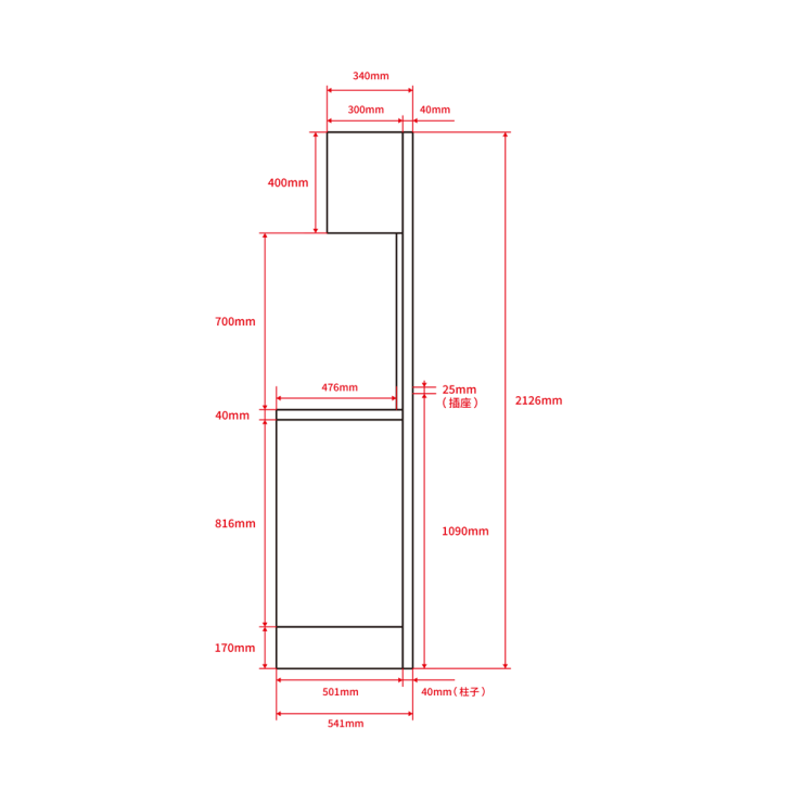 | 三列組合後尺寸: W 2031 x D 541 x H 2126 mm(組合時需加裝後方立柱 D = 501 + 40 mm) | ||