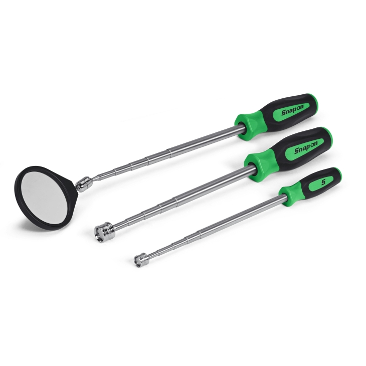 • 3件式:含一支伸縮式檢查鏡 (PTMR0G)、一支 2 lb (約 0.9 kg) (PTM2G) 與一支 5 lb (約 2.3 kg) (PTM5G) 的磁吸拾取棒,附工具收納盤 • 配備雙向旋轉檢查鏡,能提供比傳統鏡面更靈活的調整角度,可輕鬆窺視深處死角 • 採用 Snap-on 專利 Instinct® 系列握把,提供卓越的抓握感與防滑性能 • 伸縮桿採用高品質不鏽鋼製成,強度高且不易生鏽,頻繁開合依然滑順耐用