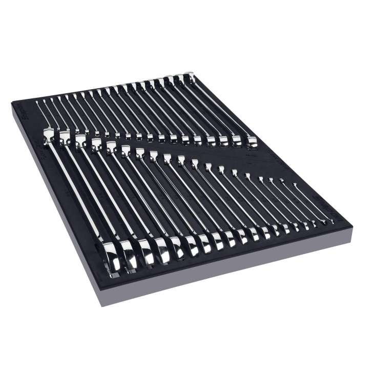 • 內含 19 件式:7 – 25 mm 公制梅開扳手及 19 件式:1/4" – 1-5/16" 英制梅開扳手,附工具收納 PRO-FI™ 泡綿