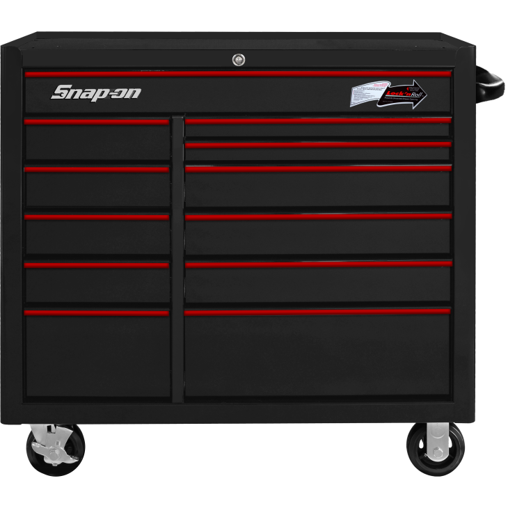 • Lock 'N Roll® 專利抽屜鎖:當您移動工具櫃時,此機構能防止抽屜因慣性意外滑出。只需輕輕一拉即可解鎖,兼顧安全性與操作便利