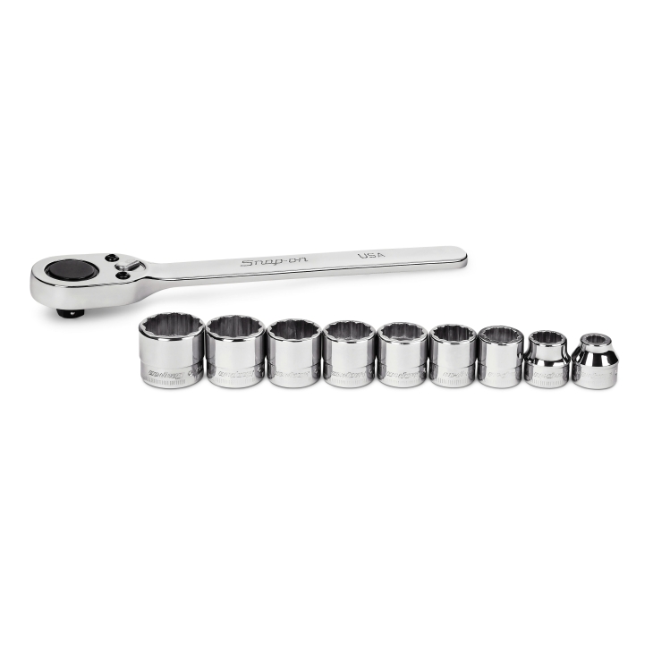 • 10 件式:含 (9) 個薄型 12 角套筒 (8 – 18 mm) 以及 (1) 支薄型棘輪扳手