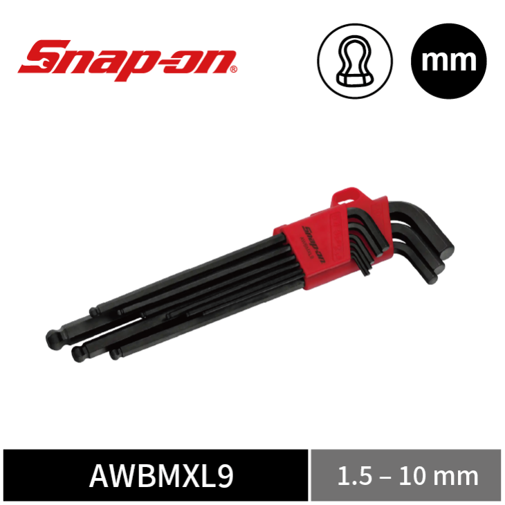 Snap-on 9件式 公制 特長 L型 球頭六角扳手組 (1.5–10 mm)