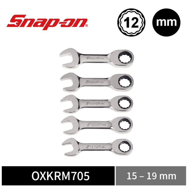 • 5 件式:15 – 19 mm 短扳手組,附工具收納盤
