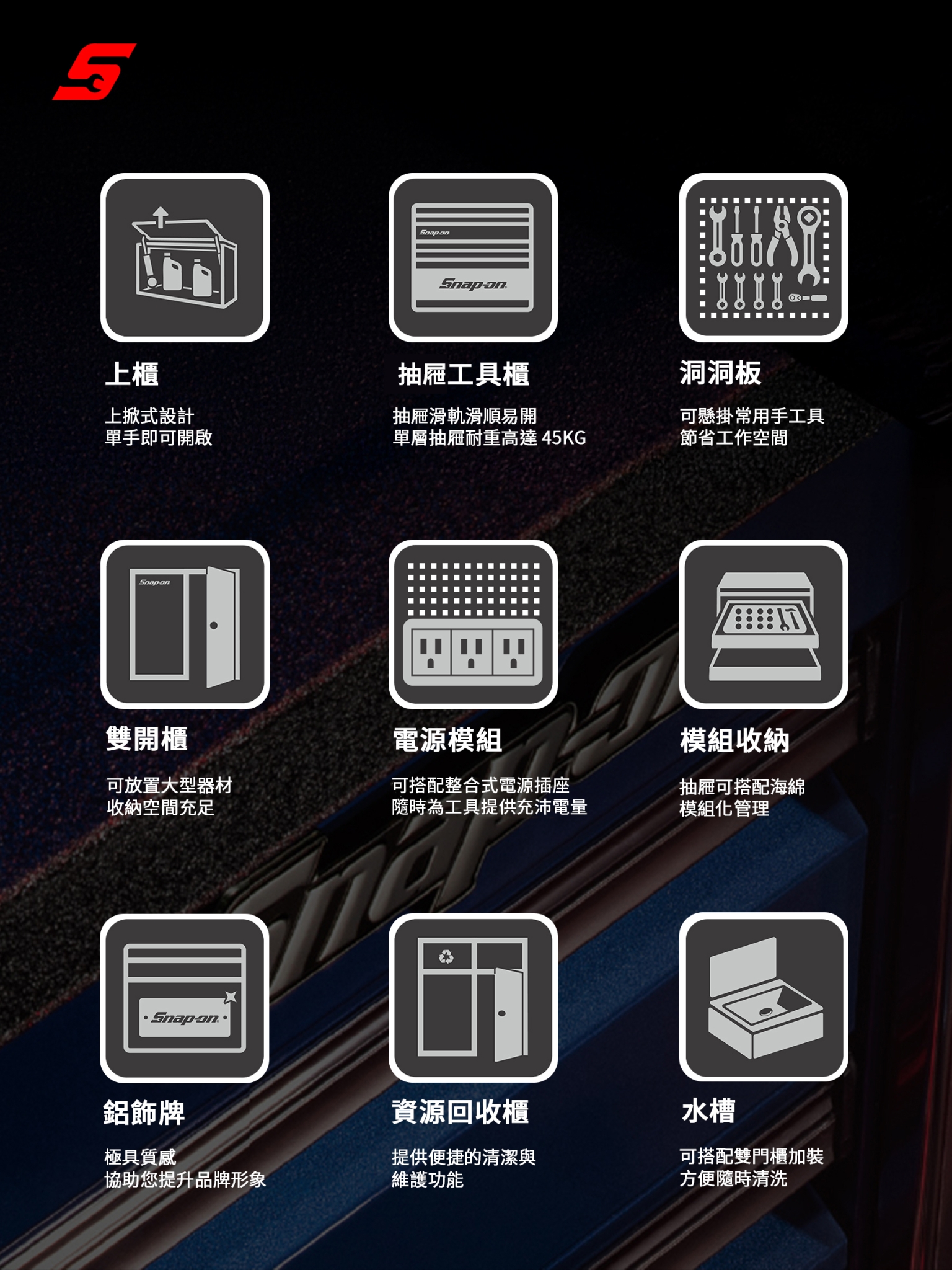 Snap-on® 系統櫃能協助您整齊有序的收納所有手工具,提升您的專業形象與顧客信任感。 | |